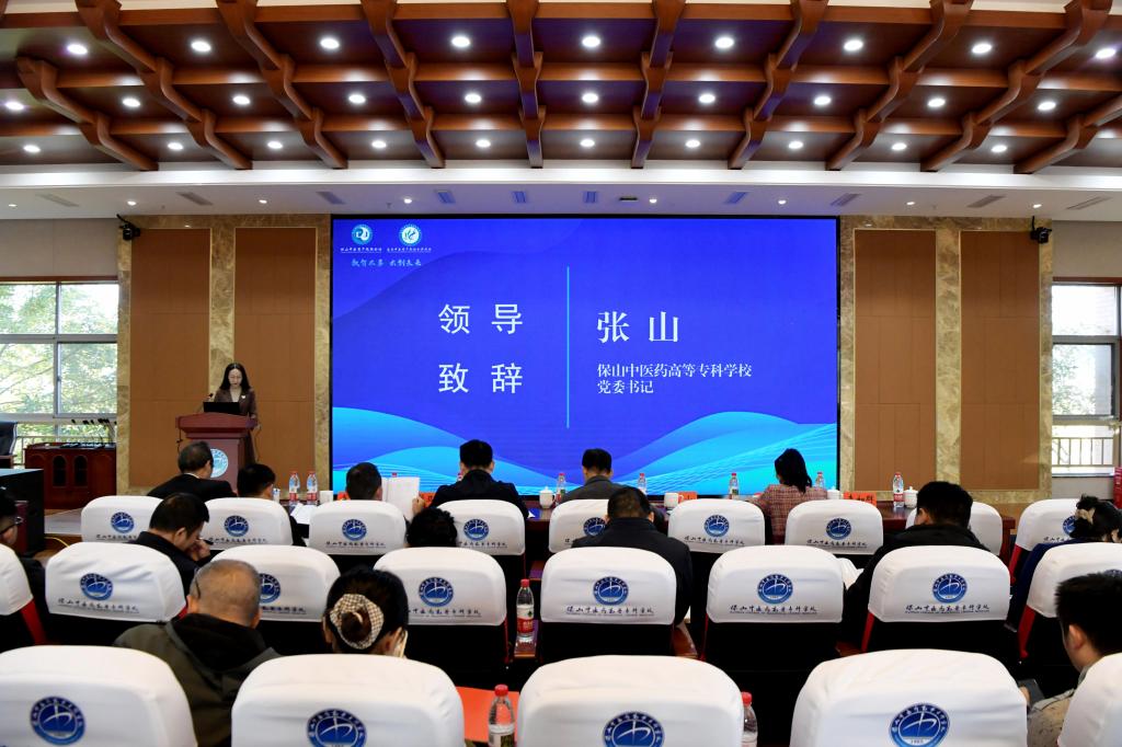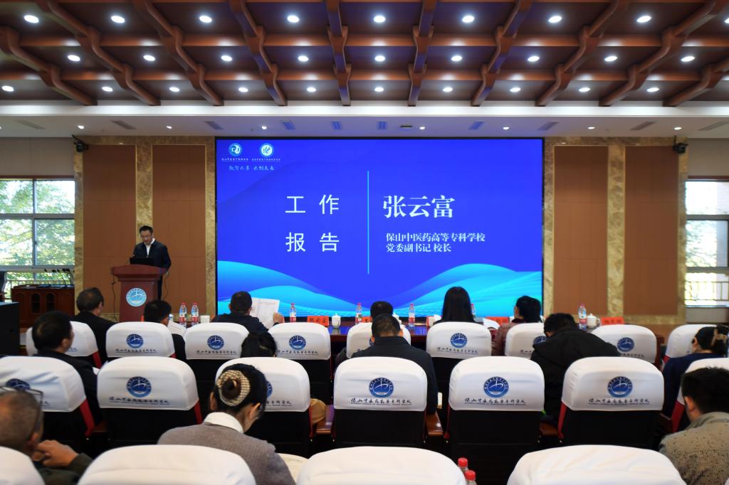 本次会议聚焦“数智本草,云创未来”主题,旨在深入探讨数智技术与中医药教学、科研及产业服务的深度融合路径,为滇西中医药传承创新与产业发展注入新动力。保山市教育体育局副局长王正卿、党委书记张山分别致辞,党委副书记、校长张云富作工作报告。