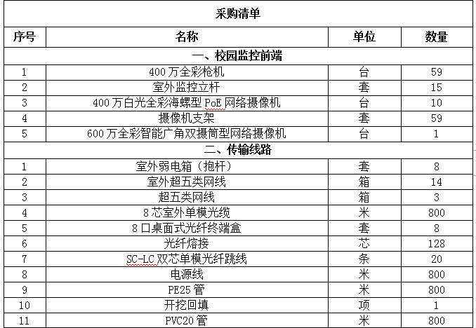 6.采购需求:本次合计建设59台枪机,1台双目全景摄像机,10台室内半球(图书馆内),15个落地监控立杆,室外弱电箱(抱杆),以及配套的传输线路,传输设备,辅材。