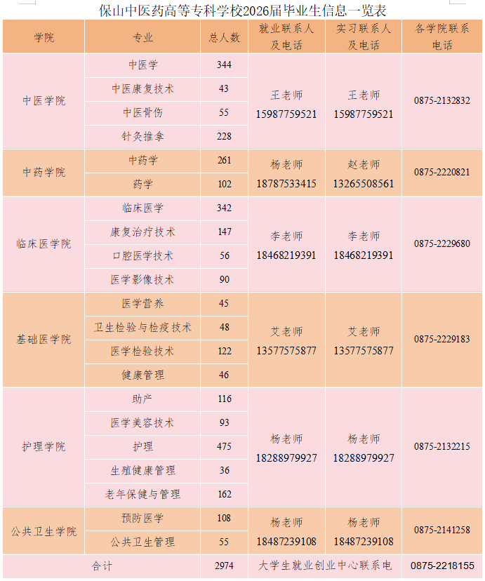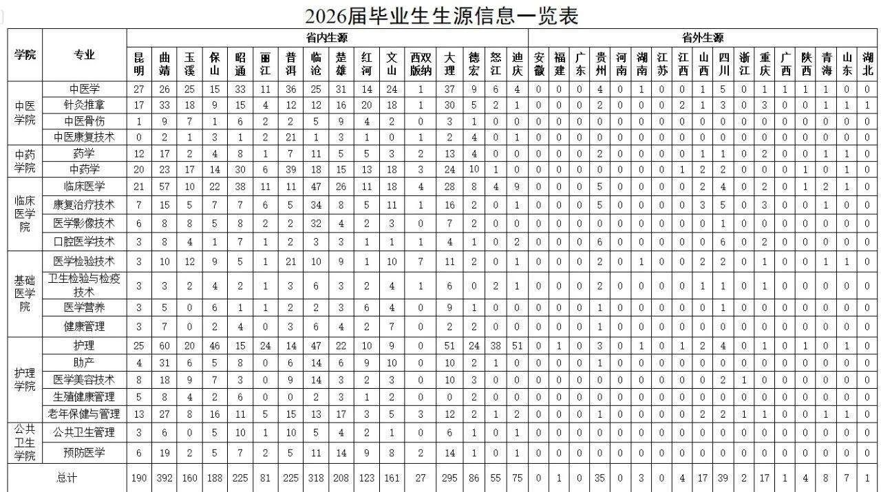 为推进学校2026届毕业生就业工作,搭建毕业生与用人单位之间的高效对接平台,现将《保山中医药高等专科学校2026届毕业生信息一览表》及《2026届毕业生生源信息一览表》公布,为用人单位提供全面、准确的毕业生生源数据,为单位精准发现人才、优化招聘决策提供参考。