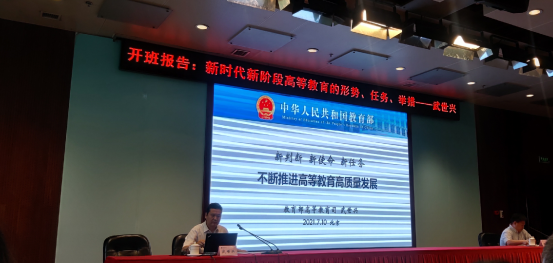 开班仪式结束后,教育部高等教育司副司长武世兴做了题为《新时代新阶段高等教育的形势、任务、举措》的开题报告。武世兴围绕习近平总书记关于高等教育的最新重要论述,从提高认识,聚焦高等教育质量发展;明确任务,建设高质量教育体系;突出重点,全面推进“四新”建设;面向未来,做好新教改、新标准、新体系建设四个方面,就目前各高校如何把握新发展阶段、贯彻新发展理念、构建新发展格局,扎根中国大地,不断提升人才培养质量,提升高等教育协调发展水平,支撑国家创新发展体系、国家治理能力和治理体系现代化等方面做了详细地阐述。