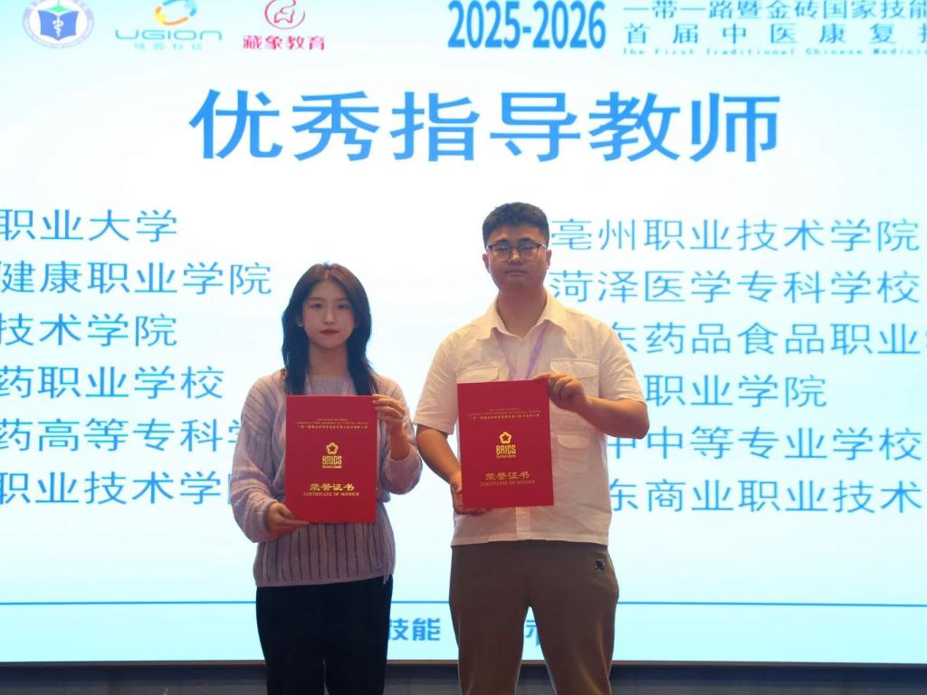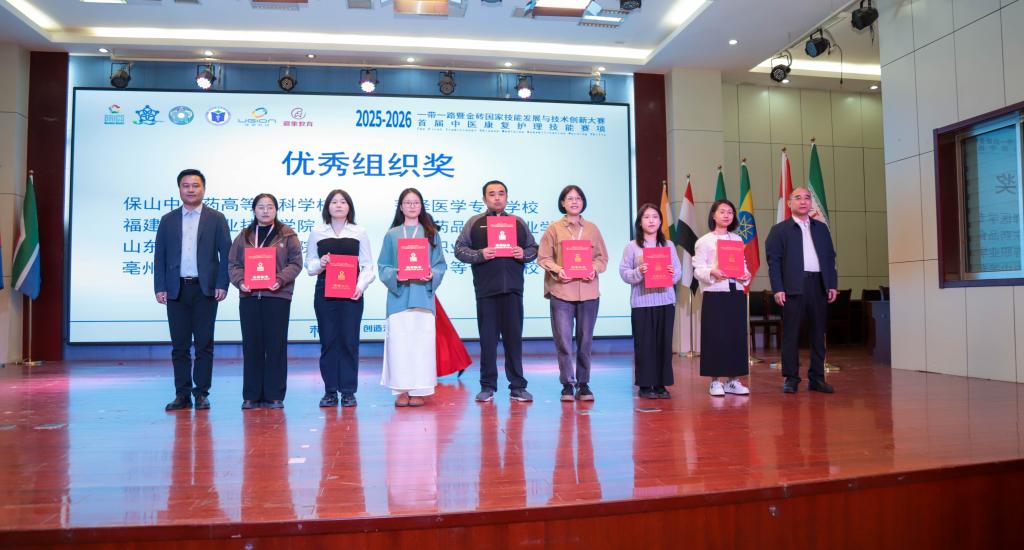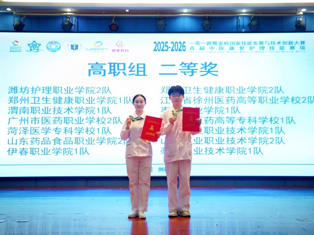 近日,2025-2026“一带一路”暨金砖国家技能发展与技术创新大赛首届中医康复护理技能赛项顺利落幕。学校获优秀组织奖,护理学院2024级医学美容技术专业刘雯雯、2025级护理专业孙浩冉团队获高职组二等奖,唐涛老师和沈晓梅老师获优秀指导教师奖,生动展现了学校师生的综合素质与昂扬向上的青春风采。
