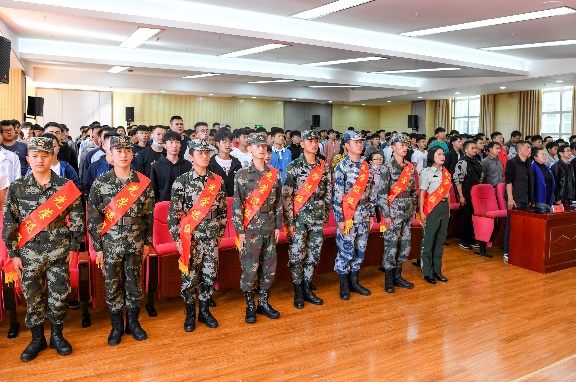 隆阳区武装部政委王峰祝贺战友从军归来、返校学习,为同学们的成长和升华感到骄傲;对学校贯彻落实让军人成为全社会尊崇职业的指导精神和武装有关工作表示敬意,让退役的战友感受到了家的温暖和关怀;向所有同学发出邀请到军营这个大家庭中书写青春华章。黄鹤平首先代表学校,对隆阳区人民武装部长期对学校武装工作的关心指导和支持表示衷心的感谢,对12名退役复学的同学能积极响应国家号召,献身国防的使命感和担当精神致以崇高敬意和热烈欢迎。希望同学们能时刻牢记军人的身份,始终按照军人的标准严格要求自己,自律、自强、积极进取,把部队的优良传统和过硬作风带到宿舍、班级、学校,成为同学当中关心国防、热爱国防、献身国防,争当新时代优秀的大学生的排头兵和模范榜样;希望退役复学同学坚定理想信念、厚植爱国报国情怀、努力学习增长本领、在加强品德修养上下功夫,谋求新的进步和提高!学校武装部及相关部门,要大力宣传国家的兵役制度和优抚、保障政策,让学生清楚退役复学、转专业、免试入读本科、就业保障等政策,切实把退役复学同学的权益维护好。