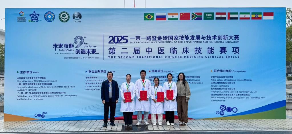 近日,2025一带一路暨金砖国家技能发展与技术创新大赛第二届中医临床技能赛项圆满落幕。学校中医学院学生陈东妹、邵仁宗、杨慧娟、龚自玉团队荣获三等奖。