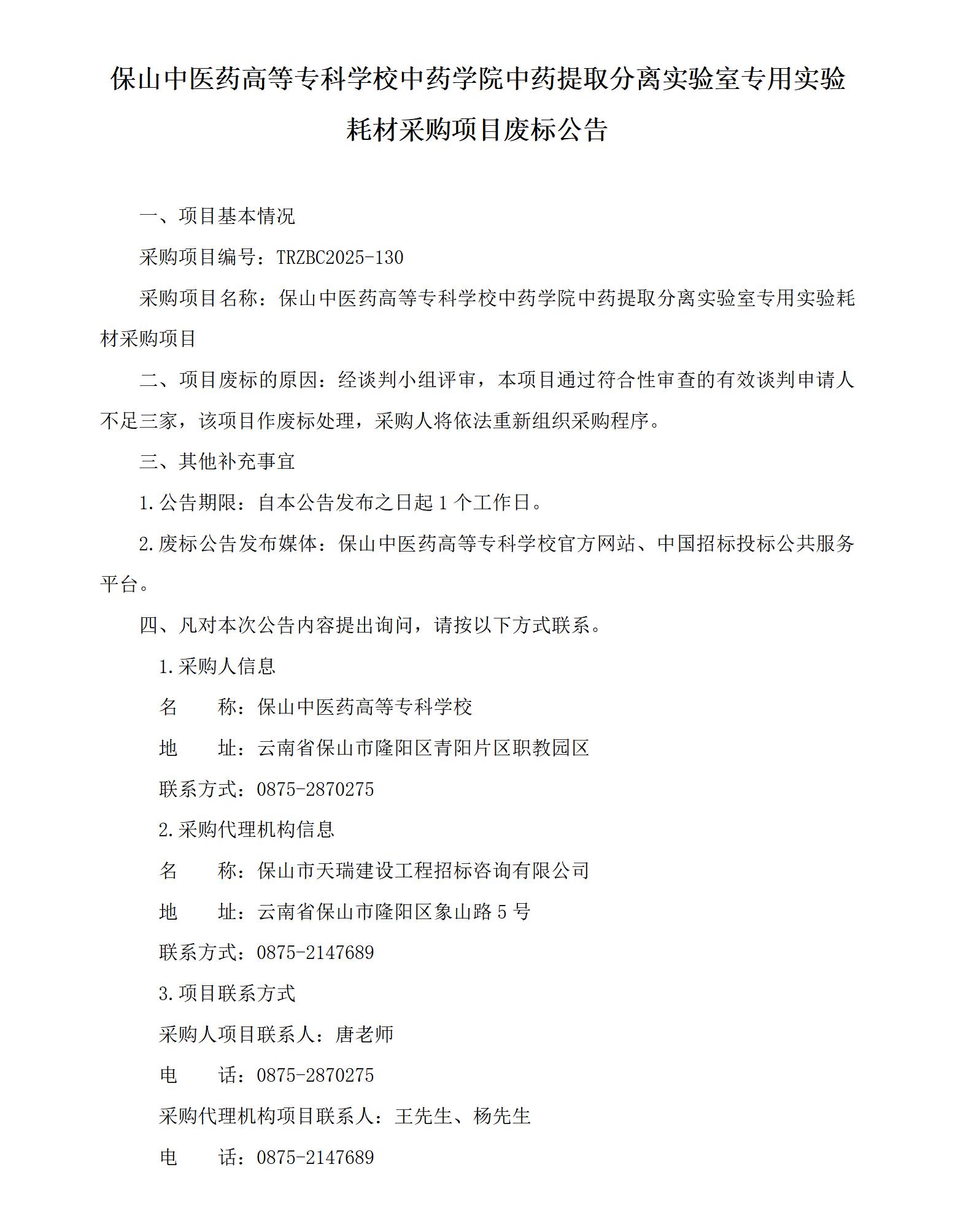 保山中医药高等专科学校中药学院中药提取分离实验室专用实验耗材采购项目废标公告